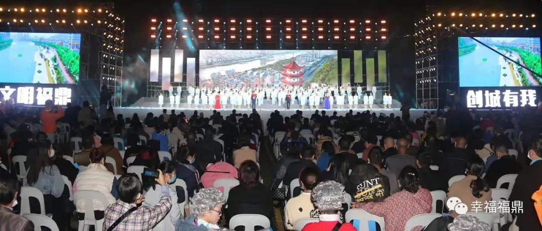 晚上7时许,夜幕下的体育中心流光溢彩,场地中央的舞台两侧,“文明福鼎”“创城有我”八个大字对称而立,格外吸睛。