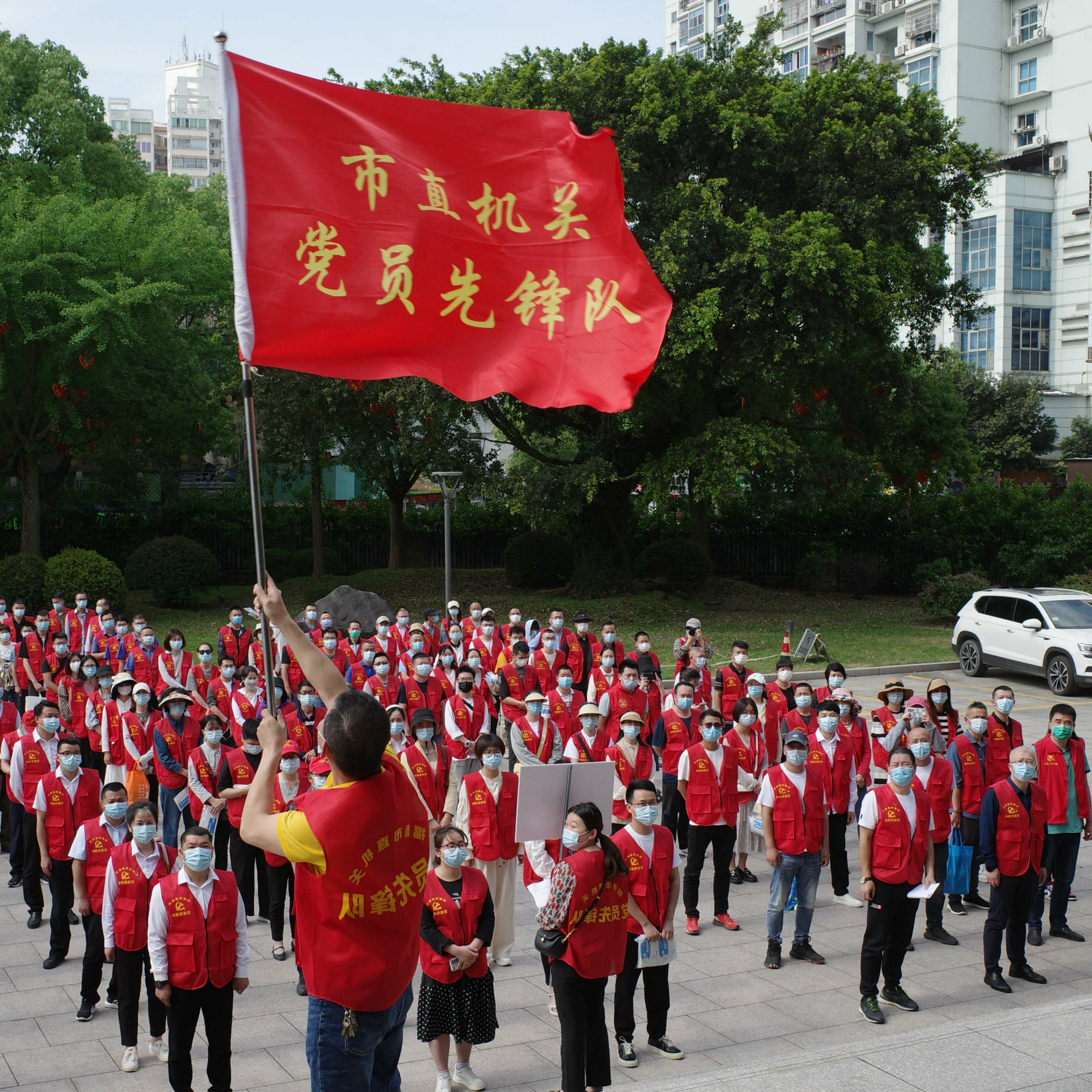 党员先锋队的成员们身穿红马甲,下沉