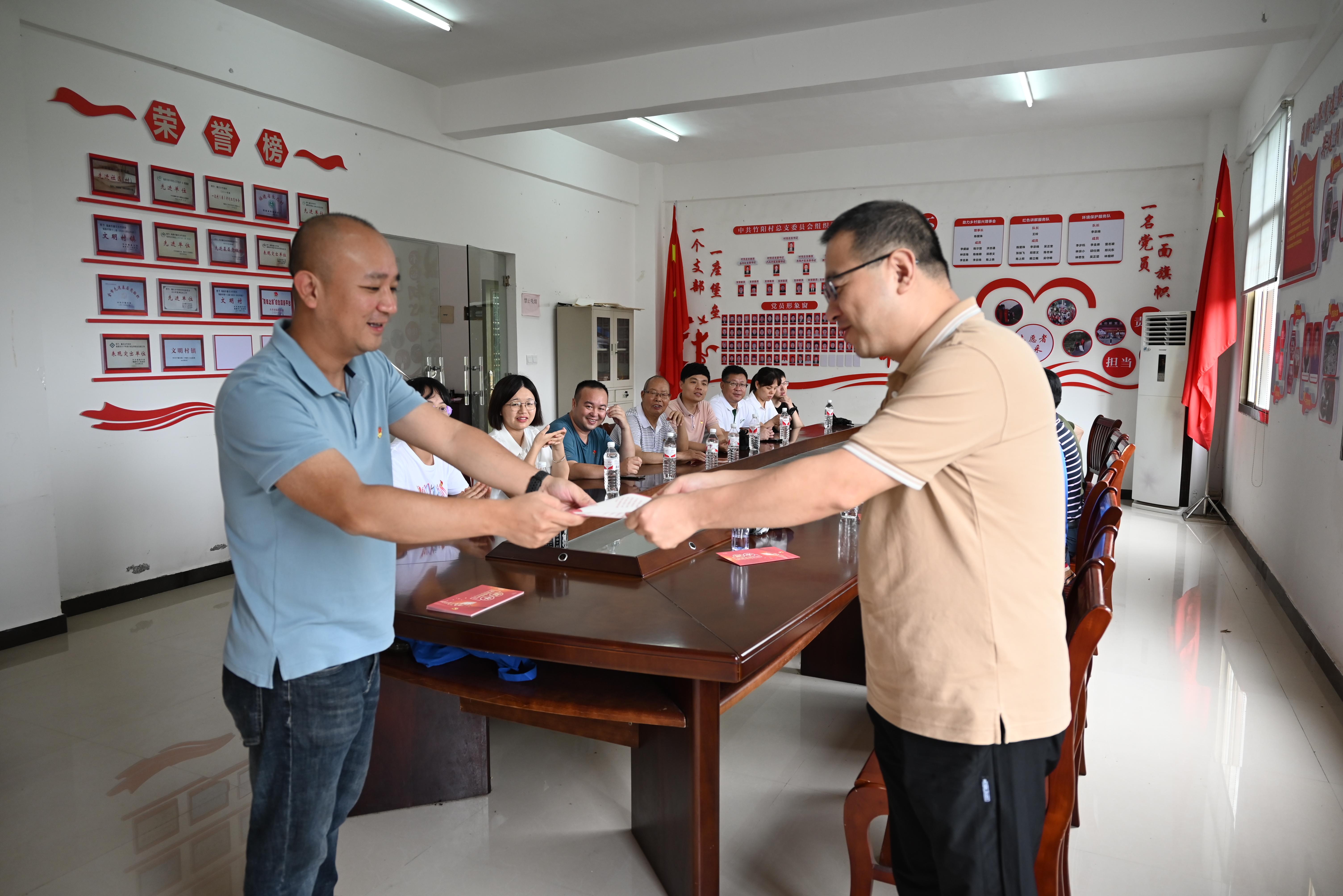 在竹阳村党员活动室,市委政法委党支部党员干部与叠石乡、竹阳村党员代表亲切座谈交流,了解竹阳村发展情况,为红色老区发展出谋划策。同时,市委政法委党支部副书记纪晓航带领全体党员重新学习了《习近平在宁德·习近平总书记提出的“滴水穿石”和“弱鸟先飞”凝成了闽东精神》文章,并组织党员干部交流体会,进一步深刻领会“闽东精神”。此外,会上还为党员干部颁发了党员生日卡、2021年优秀党员证书和2022年第二季度“党员先锋岗”,进一步增强支部凝聚力。