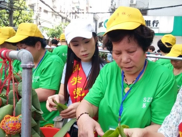 现场醒目的广告背景衬托出活动的阵容强大,统一身着绿色上衣白色长裤的十字社区志愿者更是场面中的一道亮丽的风景线,社区工作人员提前排列好包粽子的方阵,来自机关单位的党员志愿者50多名很快各就各位在包粽方阵中,开始取粽叶、填糯米、放佐料、穿粽绳……志愿者们动作娴熟,可见个个不仅是工作的一把好手,更是生活中的辛勤劳动者,很快一个个结实饱满的粽子就挂满栏杆。