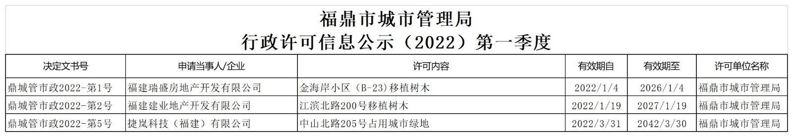 | 鼎城管市政2022-第2号 | 福建建业地产开发有限公司 | 江滨北路200号移植树木 | 2022/1/19 | 2027/1/19 | beat365网页登录_365bet官网备用网站_365betvip城市管理局 |