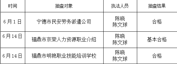 根据《中华人民共和国劳动合同法》及有关文件精神,我局分别于2018年6月1日对宁德市民安劳务派遣公司,6月14日对beat365网页登录_365bet官网备用网站_365betvip京荣人力资源职业介绍所、beat365网页登录_365bet官网备用网站_365betvip明艳职业技能培训学校进行执法检查信息如下: