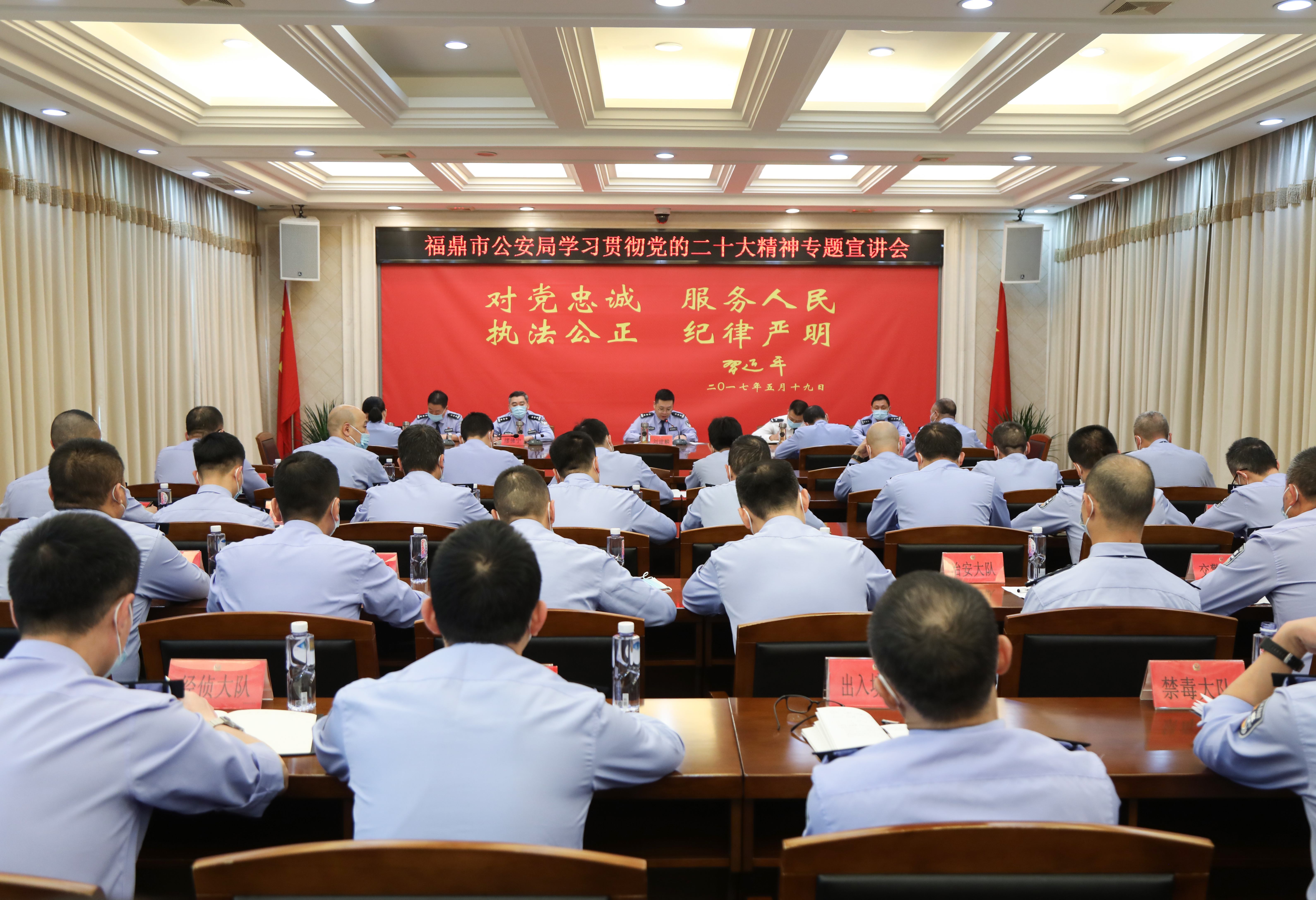 刘建麟强调,要按照习近平总书记提出的“五个牢牢把握”要求,扎实推动党的二十大精神落地见效。一是“忠”字为先,永葆对党忠诚政治本色。要紧紧围绕党中央提出的“九个深刻领会”和公安部党委提出的“六个统一”,以及省公安厅党委提出的“一个深刻领悟、五个牢牢把握”要求,真正吃准吃透党的二十大提出的新思想新论断、作出的新部署,做到学深细悟、融会贯通。二是“干”字为要,护航经济社会发展大局。要持续发扬“滴水穿石、久久为功”的精神,紧扣加快构建新发展格局,着力推动高质量发展这一主题,对照“三抓两创一目标”落实机制,把公安工作融入全市发展大局中来思考谋划,为加快建设宁德大湾区沙埕湾生态临港产业城市作出应有贡献。三是“稳”字为本,全力维护社会和谐稳定。要忠实履行好新时代公安机关使命任务,科学应对各类风险挑战,健全完善常态化疫情防控工作机制,深化涉稳风险源头治理,努力为实现党的二十大提出的目标任务创造安全稳定的政治社会环境。四是“实”字为纲,做细做实基层基础业务。要紧紧围绕“基础牢、出事少、治安好、党和人民满意”目标,深化“两队一室”改革的部署要求,以落实责任制为核心,改革重塑派出所警务勤务机制,不断增强派出所实力、激发派出所活力、提升派出所战斗力。五是“严”字为基,推进全面从严管党治警。要深刻领会全面从严治党是新时代党的自我革命的伟大实践,始终坚持“严”的主基调不动摇,严格落实新时代政法干警“十个严禁”、严禁违规宴请饮酒“六项规定”和防止干预司法“三个规定”等铁规禁令,筑牢全警拒腐防变的思想防线。