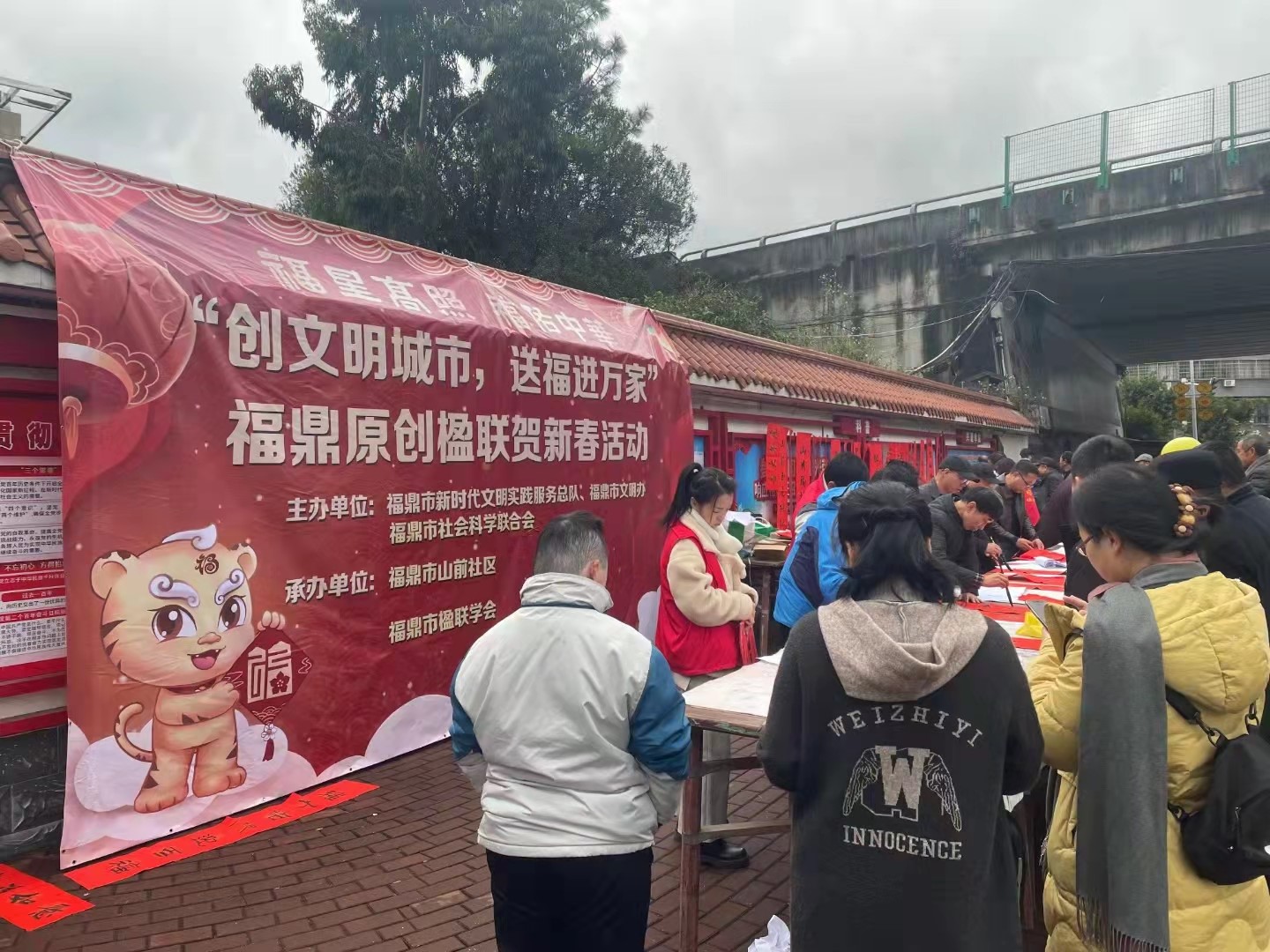 活动现场,飘满墨香。书法家们挥毫泼墨,用一幅幅满载祝福的春联,为群众送上新春最美好的祝福。“虎啸山前梅正艳,福临院落壁生辉”一幅幅精彩的书法作品,一句句吉祥如意的祝福,写出了群众的心声,写到了群众心坎上,闻讯而来的群众围满了活动现场,冬日的严寒丝毫挡不住大家的热情,很多刚写好的春联,墨迹未干,便被群众“抢”在手中。