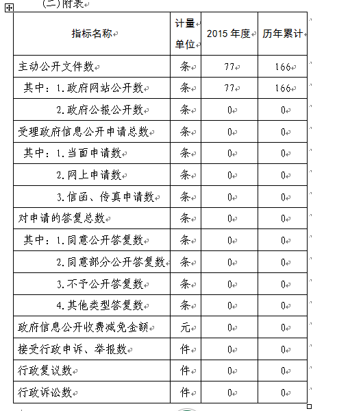 (一)主动公开政府信息的情况。我乡2015年主动公开的政府信息共77条,受理依申请公开政府信息0件,无发生复议、提起诉讼情况。