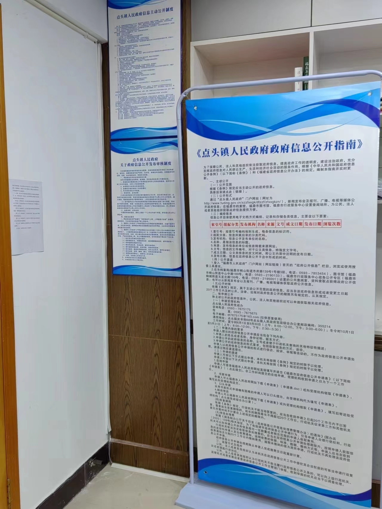 我镇在政务公开栏上墙点头镇政府信息主动公开工作制度、点头镇依申请公开政府信息工作制度、点头镇政务信息公开指南等。