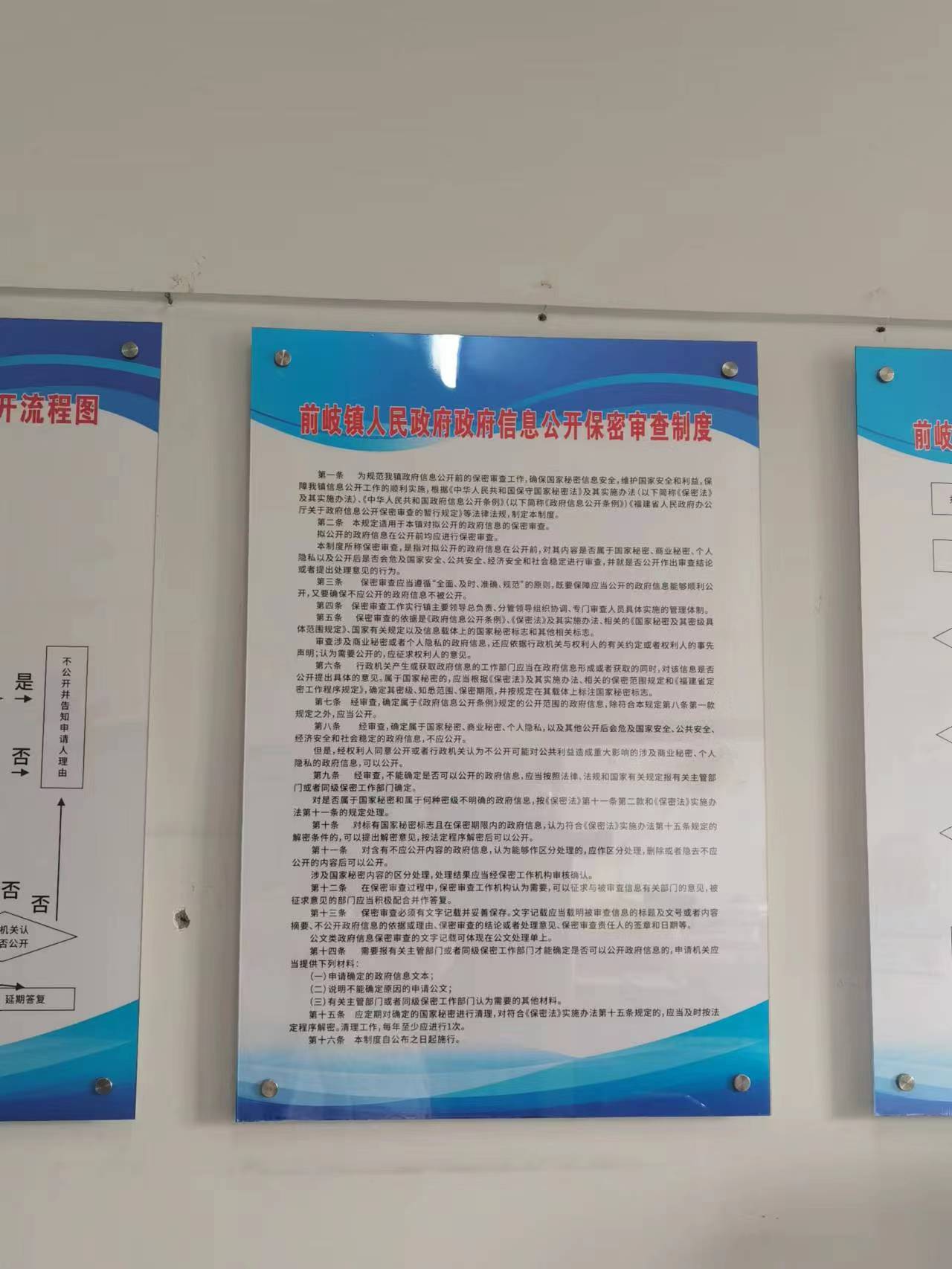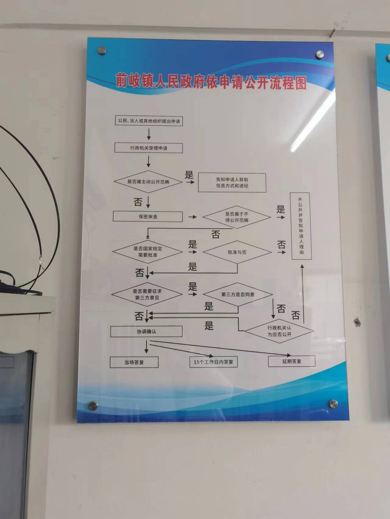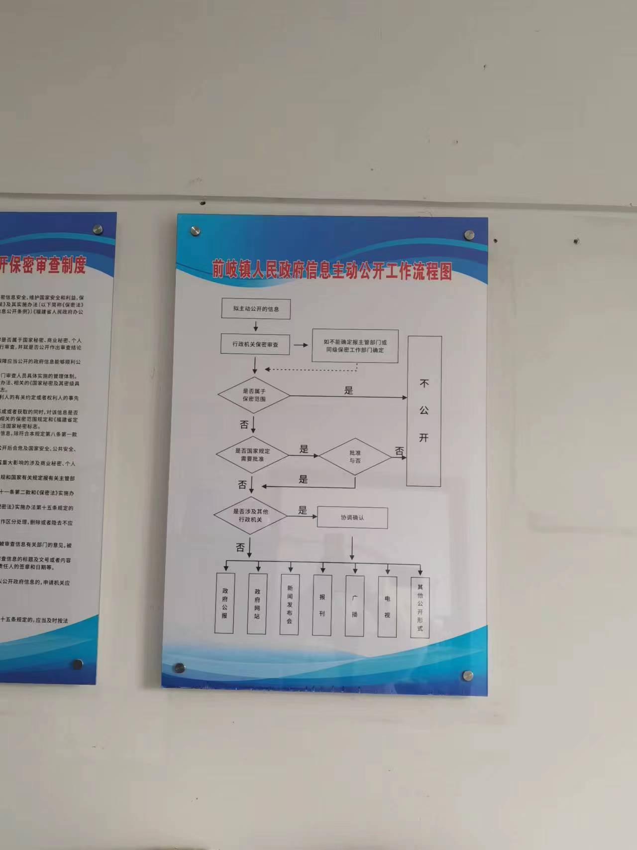我镇在政务公开栏上墙前岐镇人民政府依申请公开流程图、前岐镇人民政府政府信息公开保密审查制度、前岐镇人民政府信息主动公开工作流程图、前岐镇政务信息公开指南等。