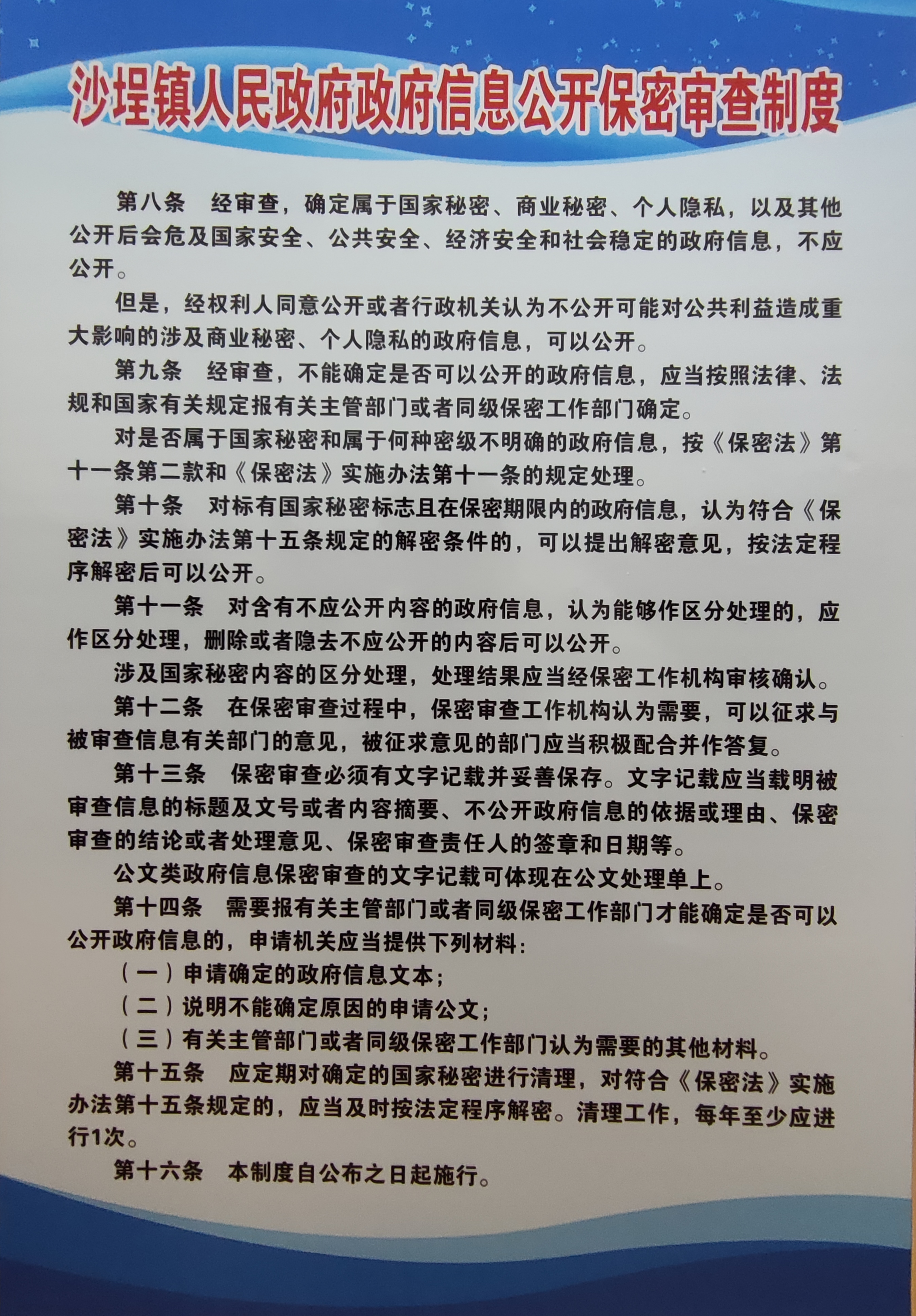 我镇在政务公开栏上墙沙埕镇人民政府政府信息公开保密审查制度、沙埕镇人民政府信息主动公开工作流程图、沙埕镇人民政府依申请公开流程图等。