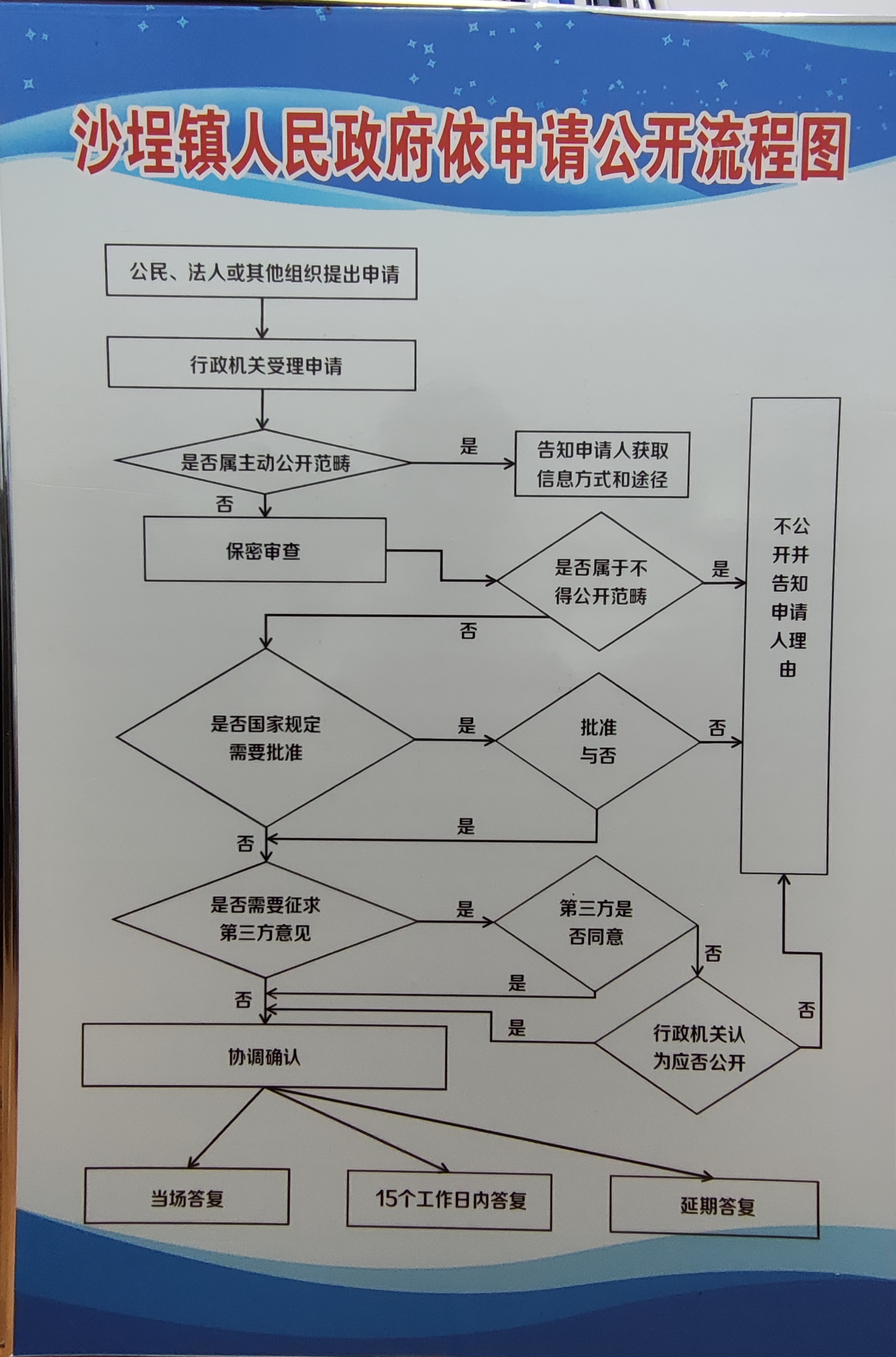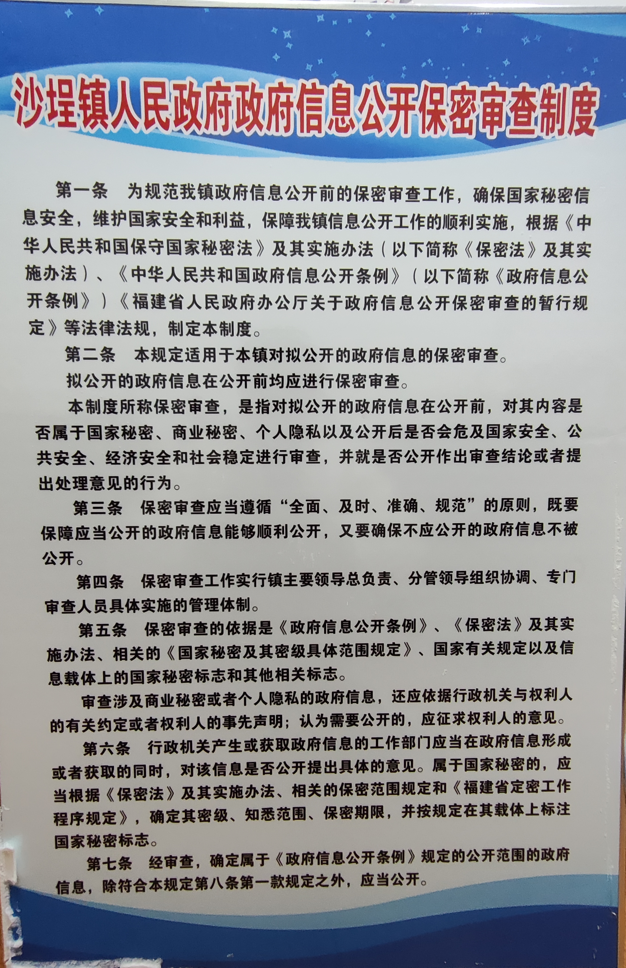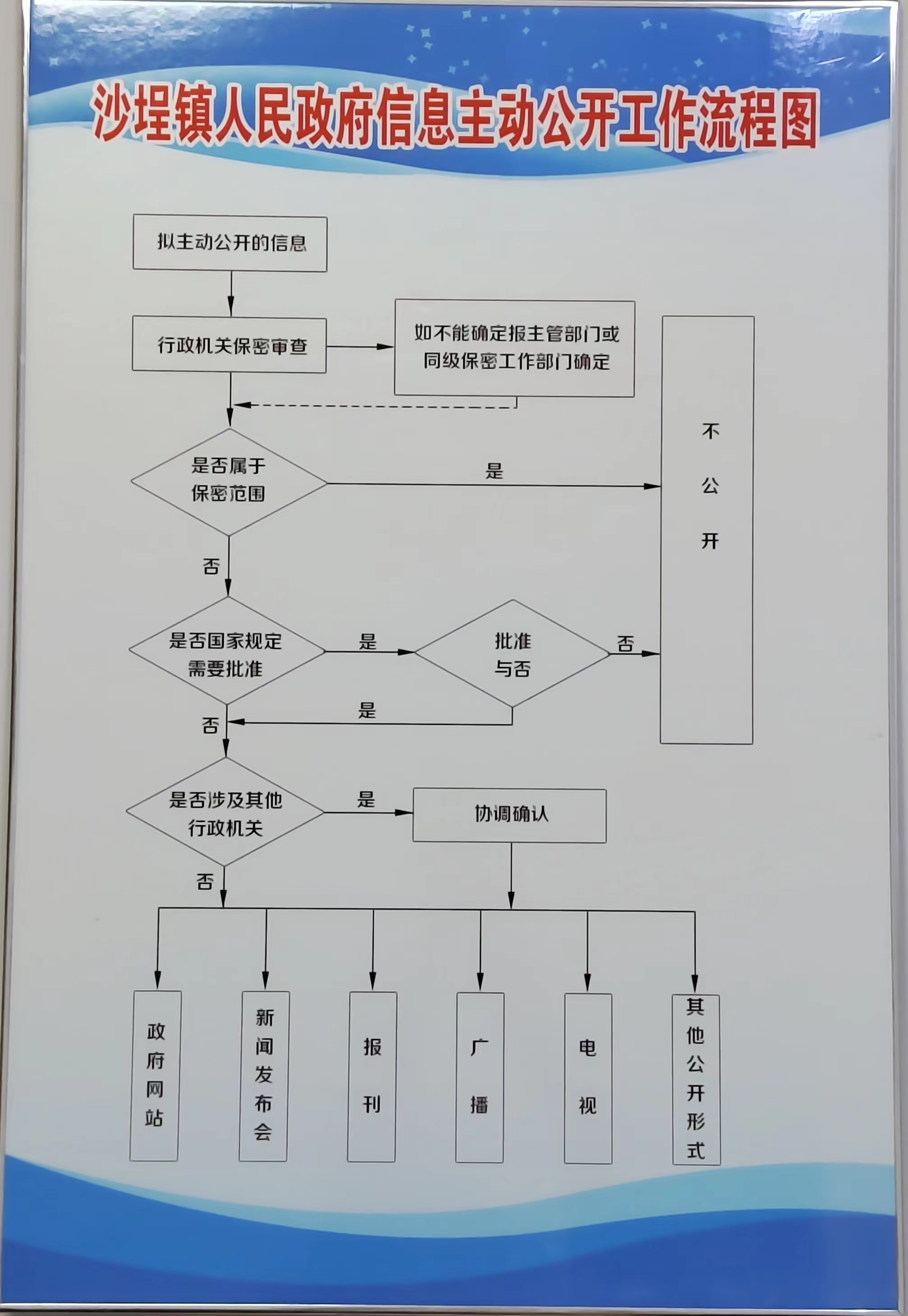 我镇在政务公开栏上墙沙埕镇人民政府政府信息公开保密审查制度、沙埕镇人民政府信息主动公开工作流程图、沙埕镇人民政府依申请公开流程图等。