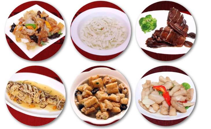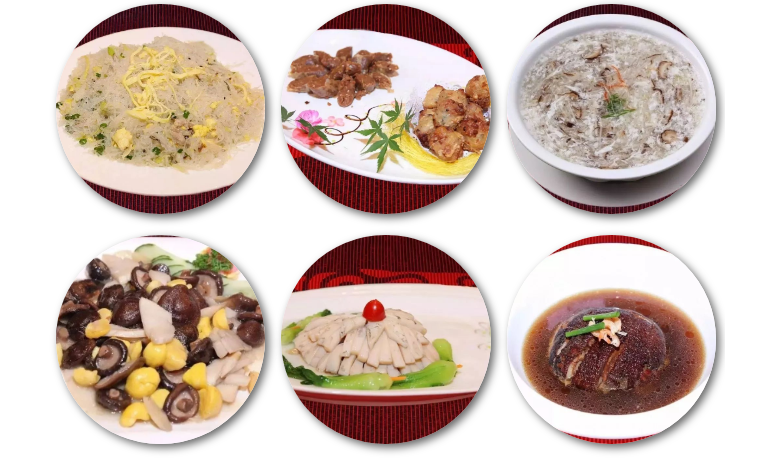 “鼎菜”形成与发展,以师授徒承的方式,创造了十八大碗、二十四大碗、八盘五品等传统宴席。如干贝彭海、爆炒海蜇、酸辣海参、龙舟鱼卷、发菜鳗泡等。这些菜制作原料涵盖了山珍海味,烹饪技法通常以炸、爆、炒、蒸、焖、炖、烩、卤、拌、挂霜为主。以爆炒海蜇为例,海蜇加热便化为水,必须大火爆炒,再佐以酸辣调味,适度勾芡,没有高超的厨艺,很难做到。