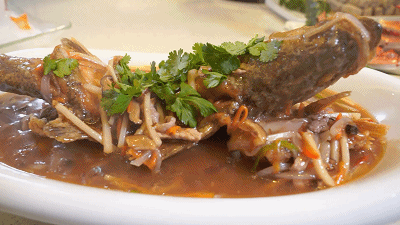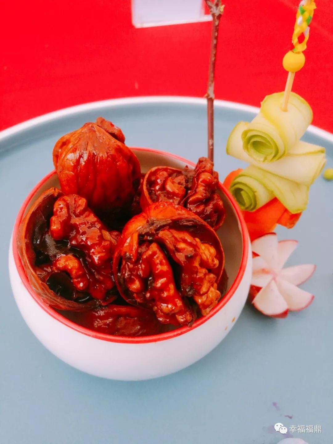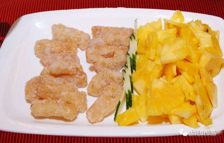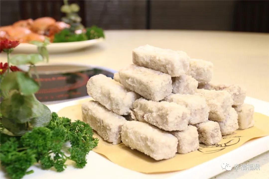 当然,在这里还能品尝到福鼎特色传统老菜“八盘五”。“八盘五”中有一道菜,是宋王朝从高丽国引进的,菜名就叫高丽,本地厨师将原先以鱼肉为原料,改为以猪肥膘为原料,外皮酥脆裹着咸蛋黄,咬上一口,颊齿留香,肥而不腻,令人回味无穷。如以福鼎芋为原料,则称假高丽,即“挂霜槟榔芋”。