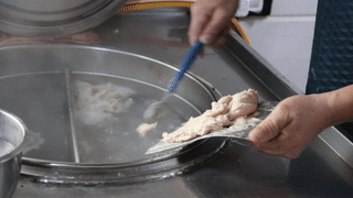 “老板,来一碗肉片。”“好嘞!”只见店家从早已配好的肉泥中挖出一大勺放到钢板上,铺平摊薄,然后用小勺子将一片片肉泥快速刮到沸水锅内。盖上锅盖,不一会儿肉片就熟透了,一个个粉嘟嘟的漂浮在水面上,装碗、调料,撒上绿油油的香菜,吃一口肉片再呷一口酸辣汤,弹爽中带着肉香,浑身都冒着热乎,很多人的清晨就这样开启了。