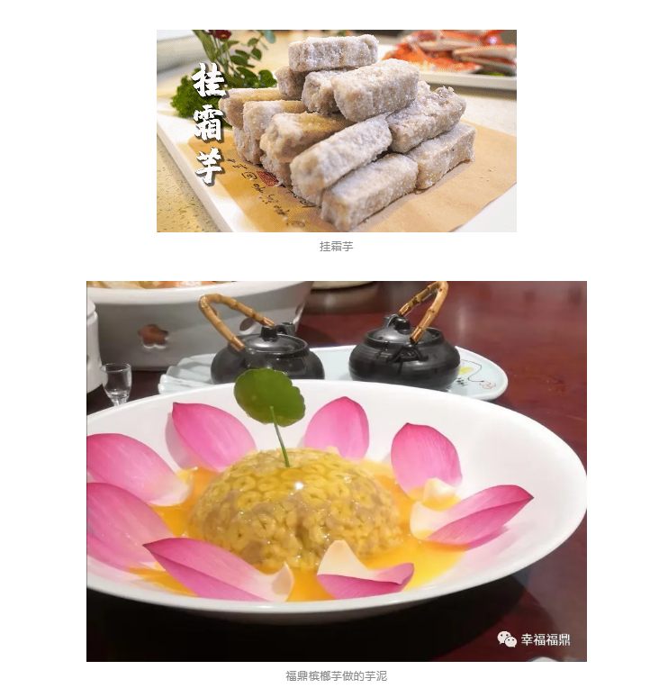据史料记载,槟榔芋在福鼎栽培有300年左右历史,因芋肉细、松、香、酥,带有槟榔花纹,煮之浓香扑鼻,闻之清香宜人,食之松酥细滑,素有“芋中之王”的美誉。