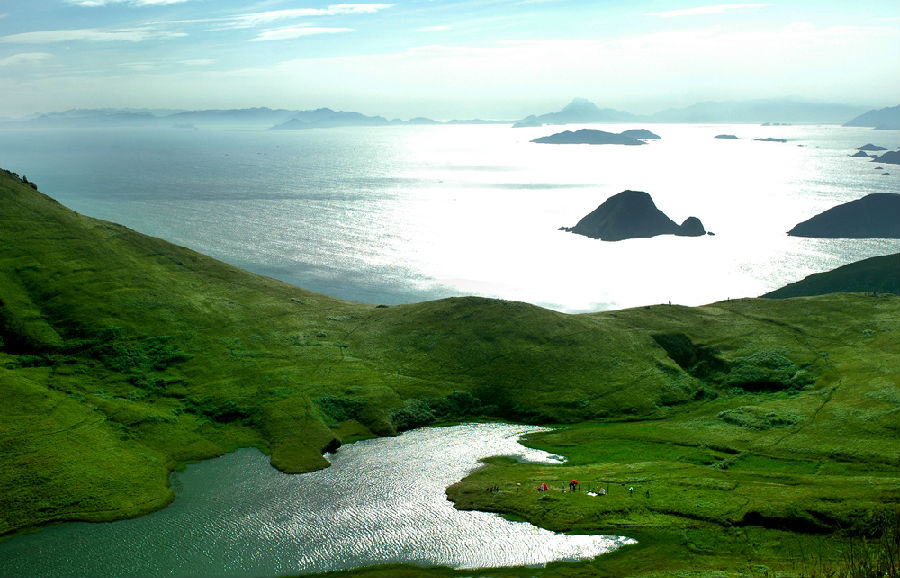 岛上风光旖旎,有天湖泛彩、蚁舟夕照、少滩奇纹、南国天山、海角晴空等胜景。在碧波万顷的东海之上,海拔200米处,镶嵌着大小两个湖泊,因而素有“海上天湖”之称。湖周群峰环拱,其状似盂,嵛山岛由此得名。大天湖面积近千亩,可泛舟畅游;小天湖200多亩。二湖相隔1000多米,各有泉眼,常年不竭,水质甜美,水清如镜。因日而耀,因风而皱,时有白鸥翔集。湖四周山坡平缓,形成天山万亩草场,有“南国天山”的美誉。恍若置身于“天苍苍,野茫茫,风吹草低见牛羊”的大西北草原,令人感叹万千。草浪滚滚与碧海蓝天,组成一幅明丽的山海全景图。
