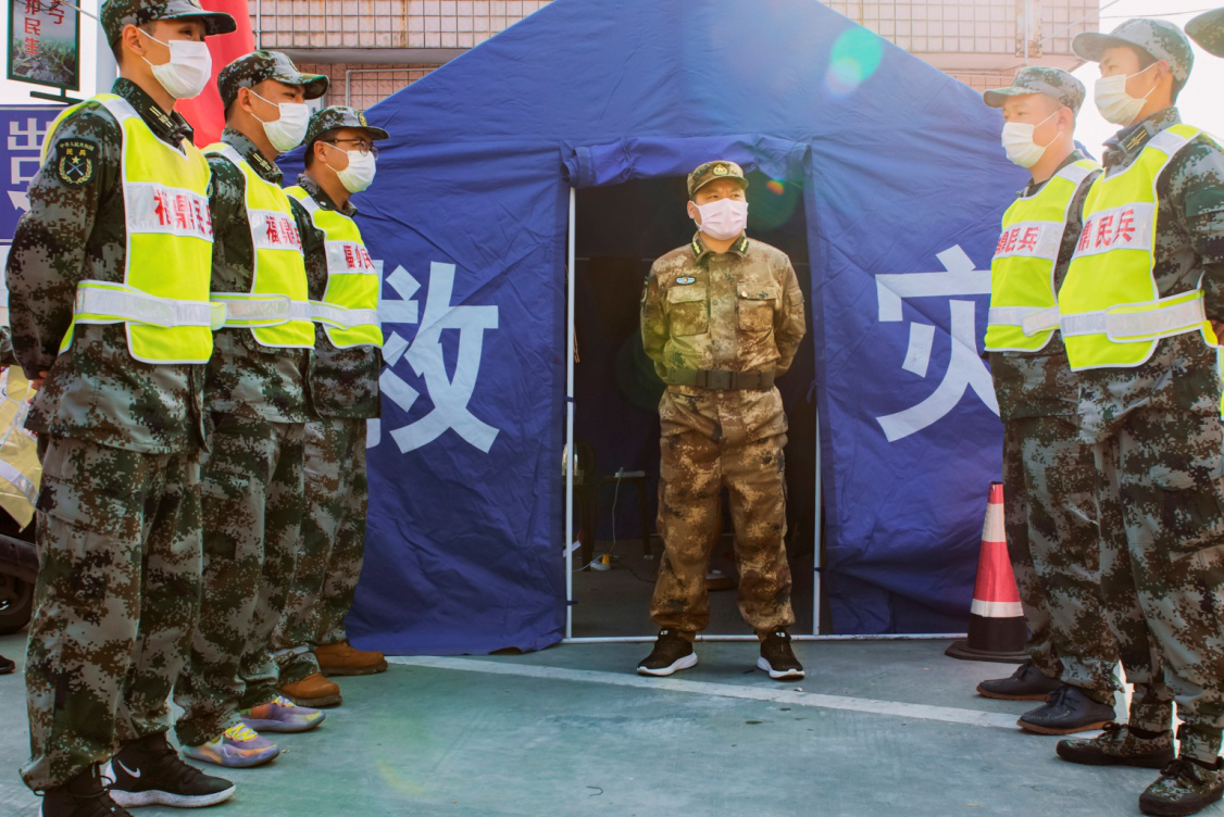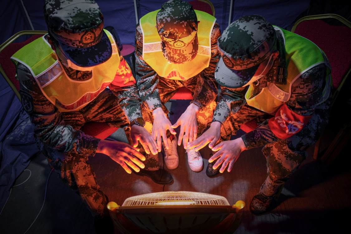 初春早晚温差大,2020年2月23日夜,执勤民兵季昌湖、李东东、林甲亮在救灾帐篷内取暖。