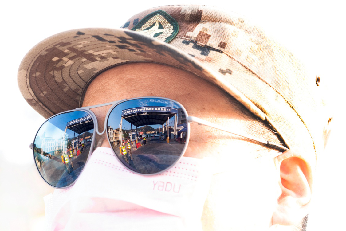 护目镜紧缺,用遮阳镜凑合,王怀灿部长就这样从2月1日开始坚守在省际检查站一线带班(2020年2月21日摄)。