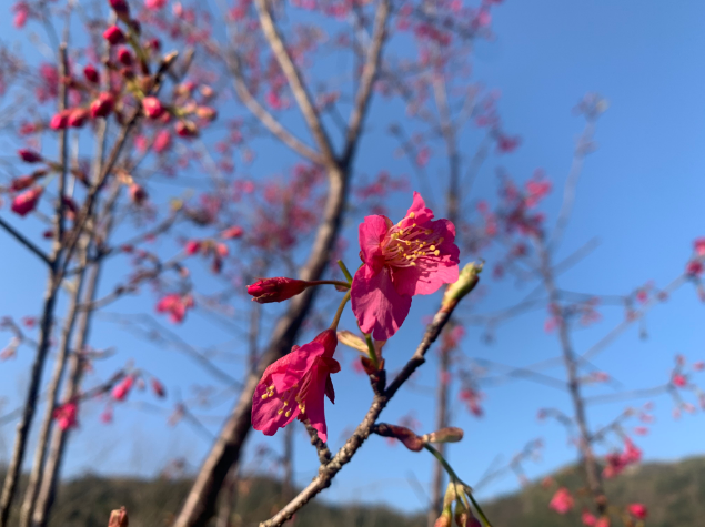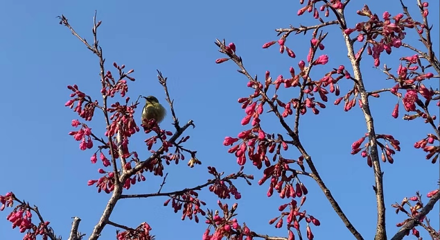 山深未必得春迟,处处山樱花压枝。今年正月寒风虽凛冽,但在叠石乡库口村的芦花公园樱花林,却有一抹粉色悄悄地跳上枝头,在暖阳的映照下更显俏皮可爱,运气好时还能遇见叉尾太阳鸟在满树樱花间蹦来蹦去采食花蜜,簇簇红花点缀在绿水青山间,构成了一幅绝美的早春美景图。待到花期全盛时,漫步樱花盛放的美景中踏青赏花,岂不烂漫。