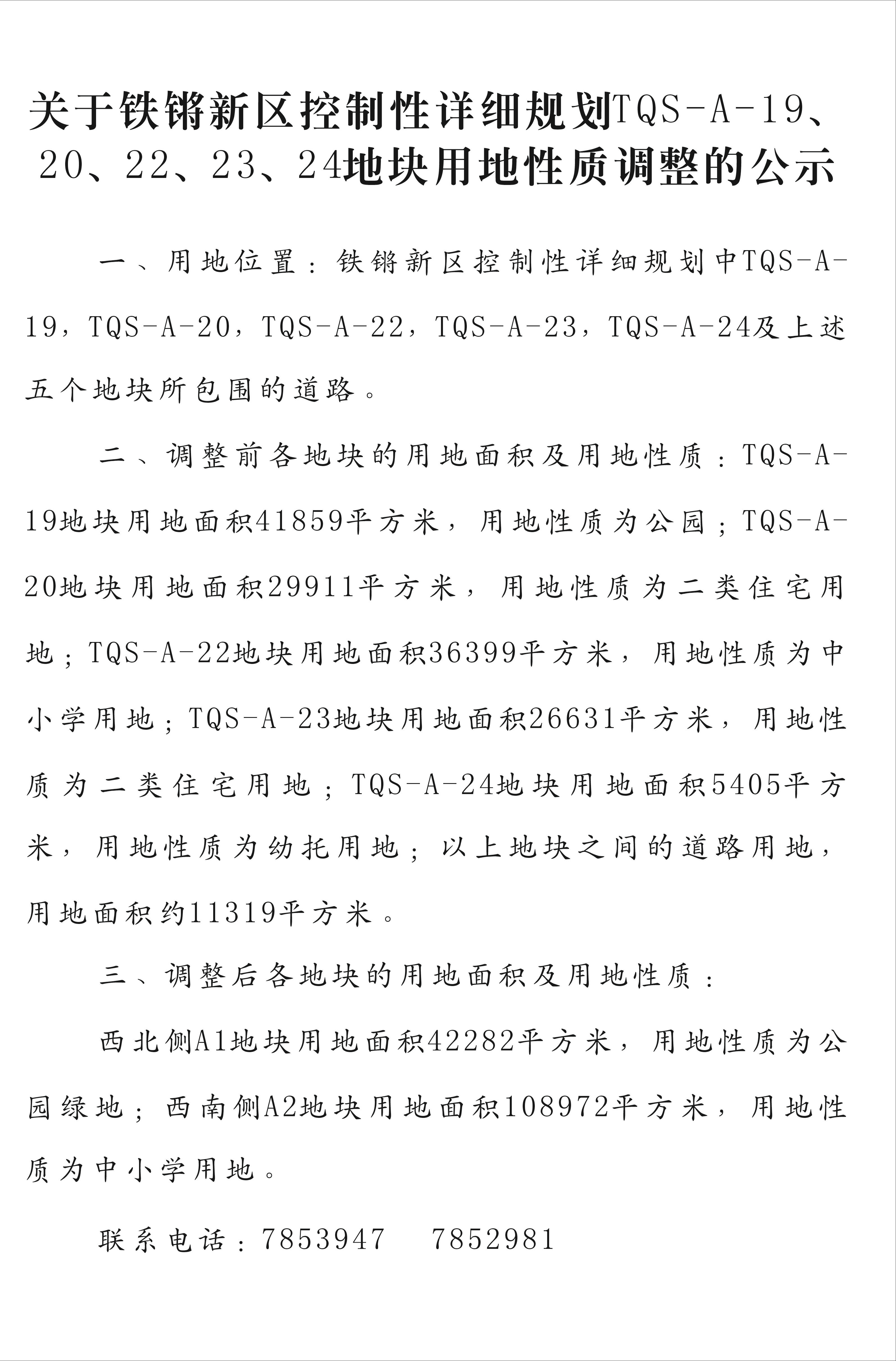 本局拟办理铁锵新区控制性详细规划相关地块用地性质调整事宜,根据《中华人民共和国城乡规划法》第四十八条之规定,现履行公告告知与该行政许可事项有直接重大利益关系的申请人、利害关系人的依法享有陈述、申辩和要求听证的权利。符合以上要求的当事人可在本公告之日起二十日内向我局以书面的法定形式进行陈述和申辩及要求听证;逾期未进行陈述、申辩和要求听证的,视为放弃上述权利。