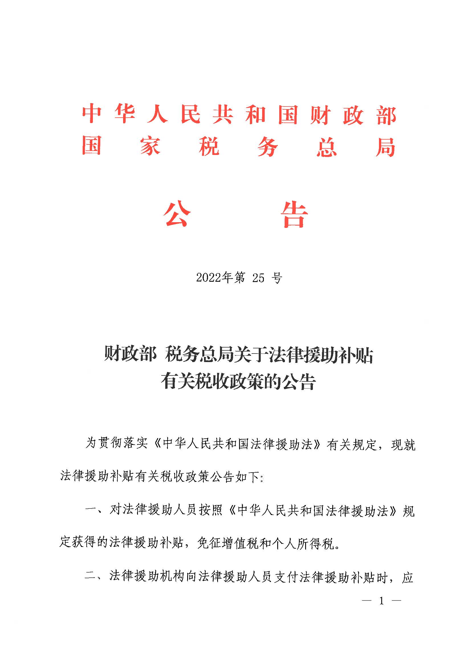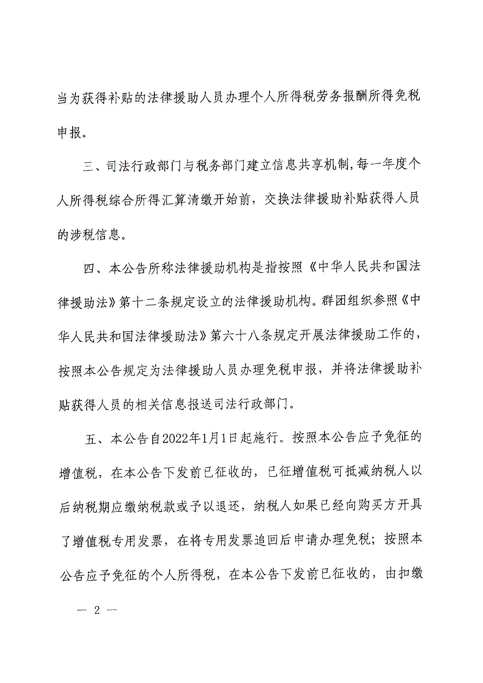 财政部 税务总局关于法律援助补贴有关税收政策的公告