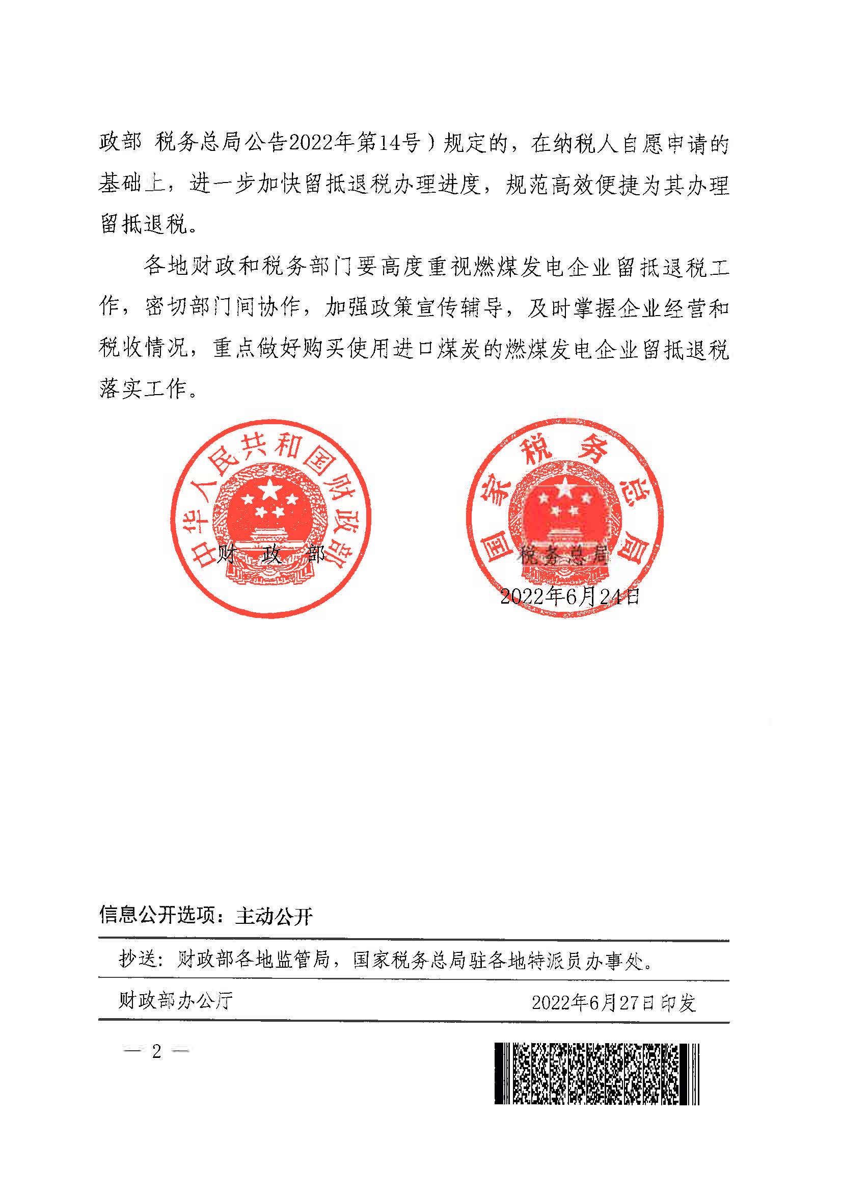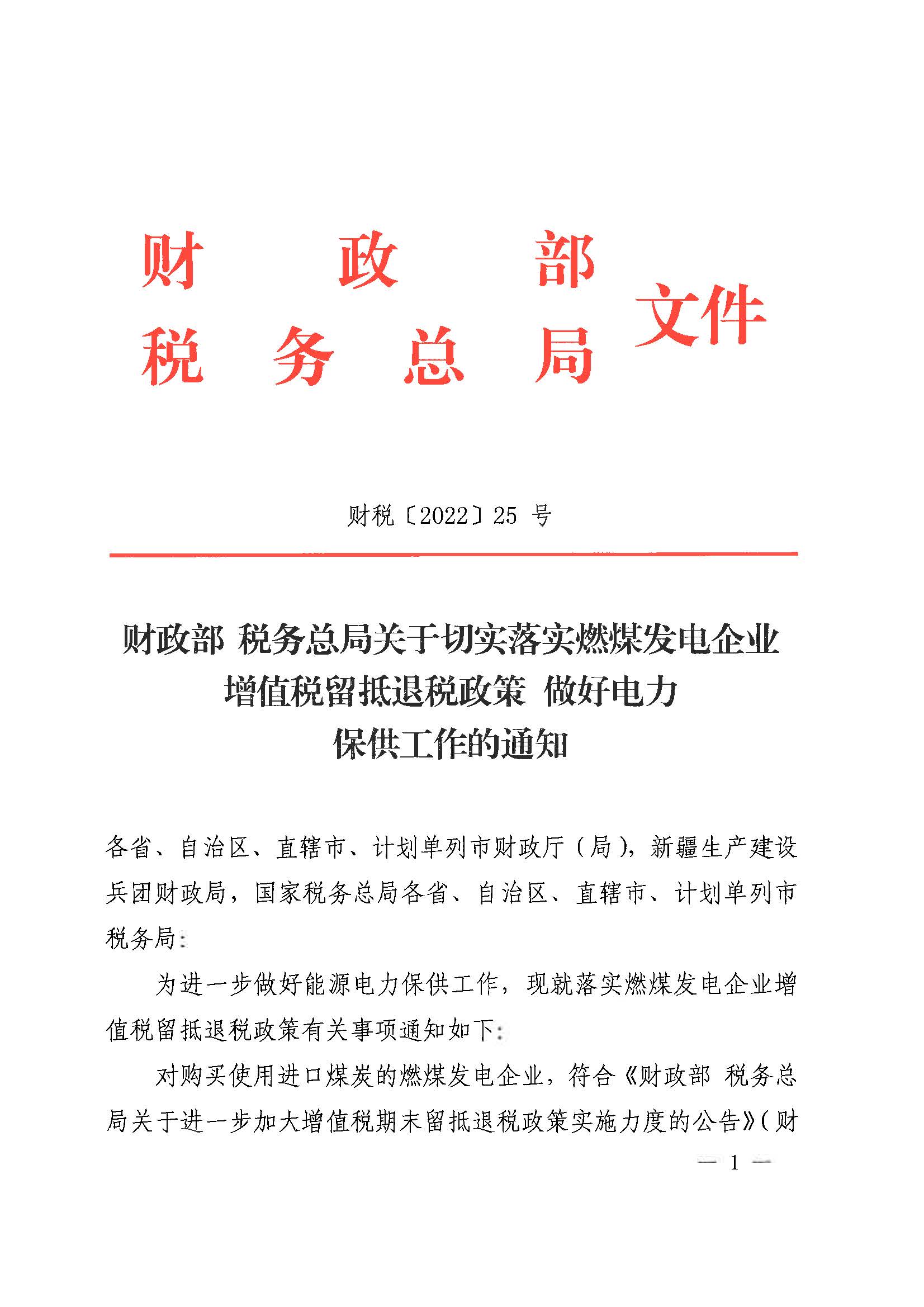 财政部 税务总局关于切实落实燃煤发电企业增值税留抵退税政策做好电力保供工作的通知