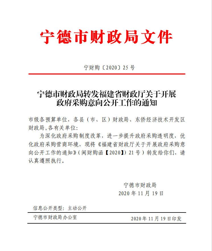 宁德市财政局转发福建省财政厅关于开展政府采购意向公开工作的通知